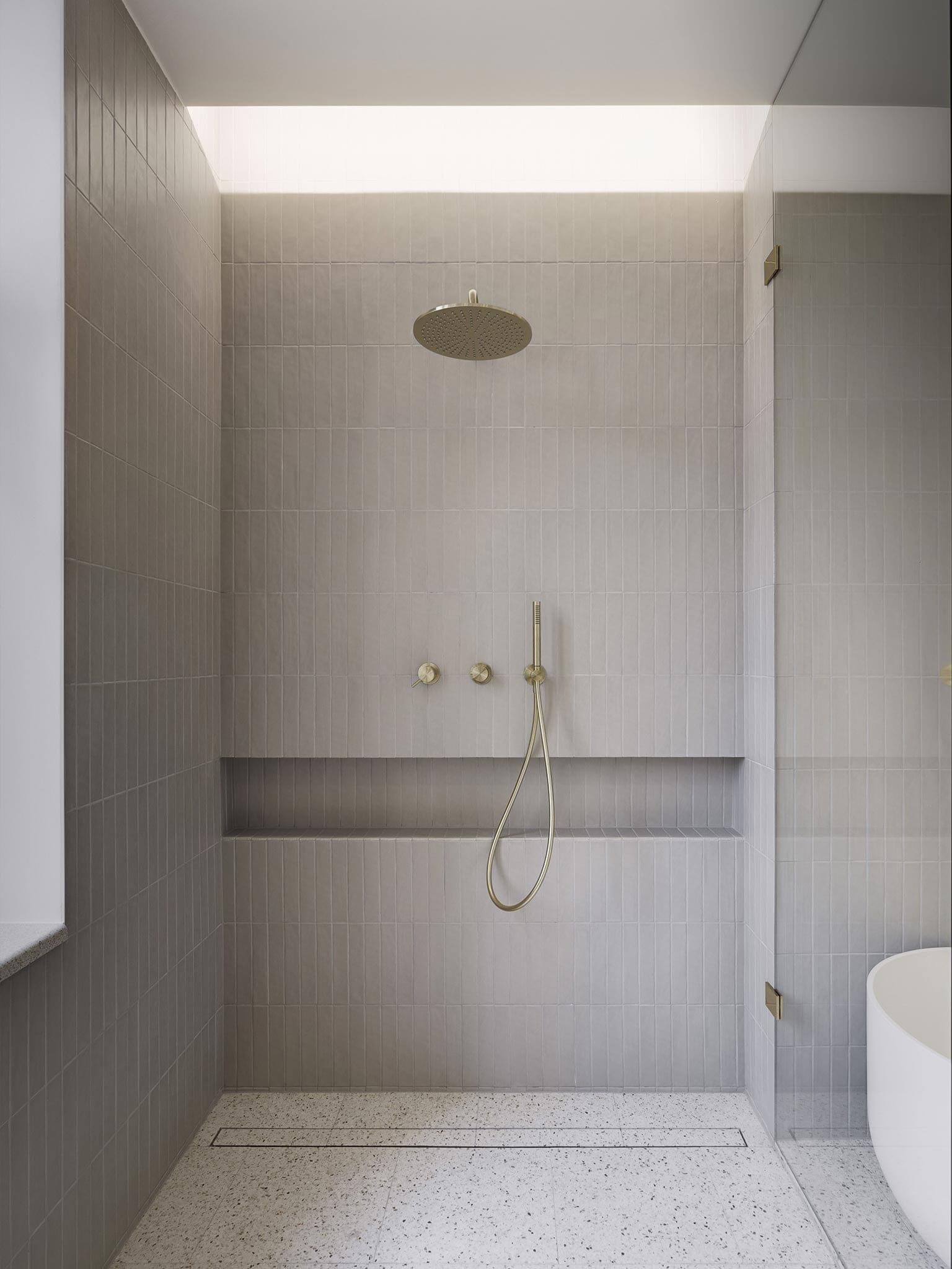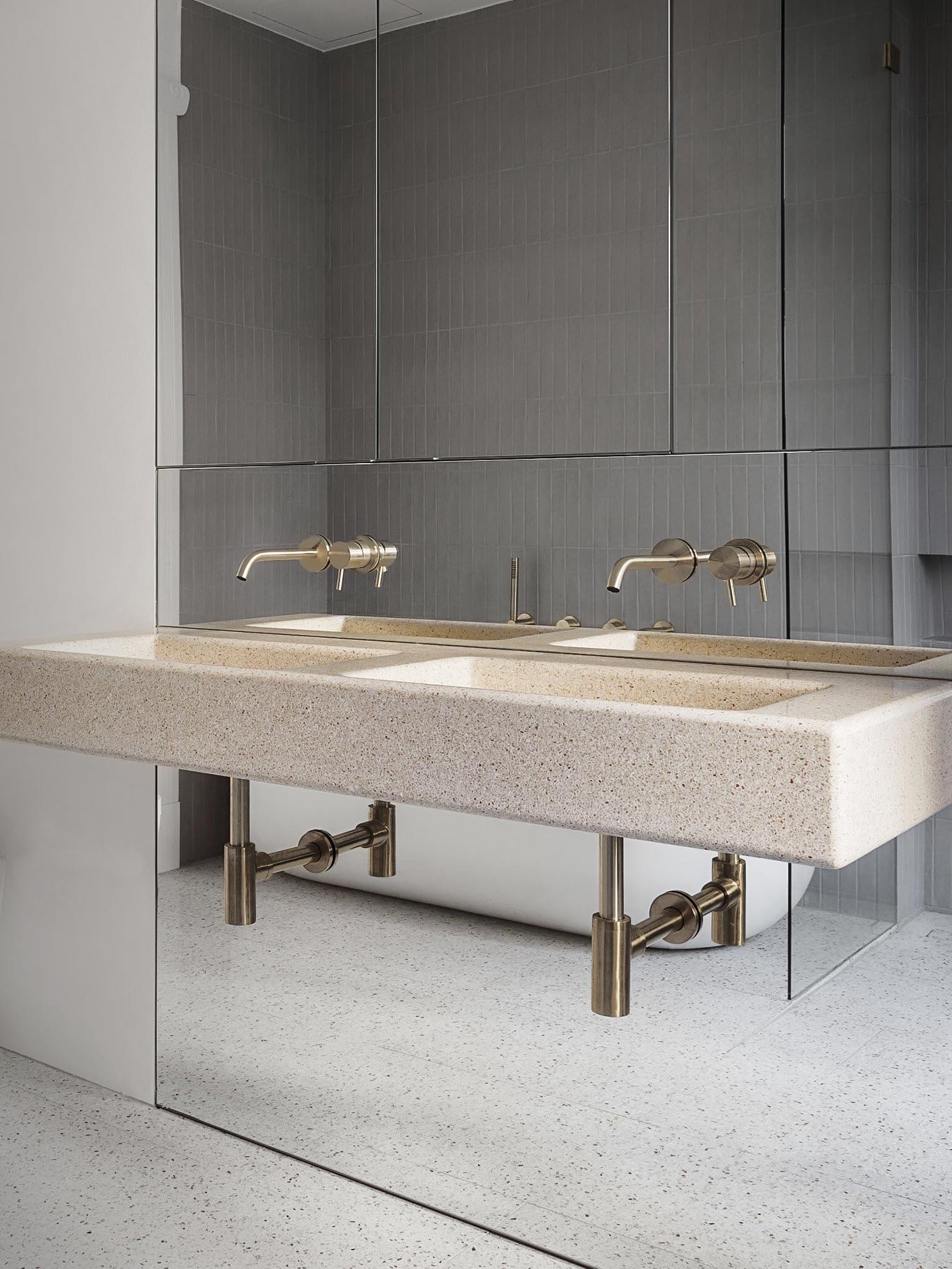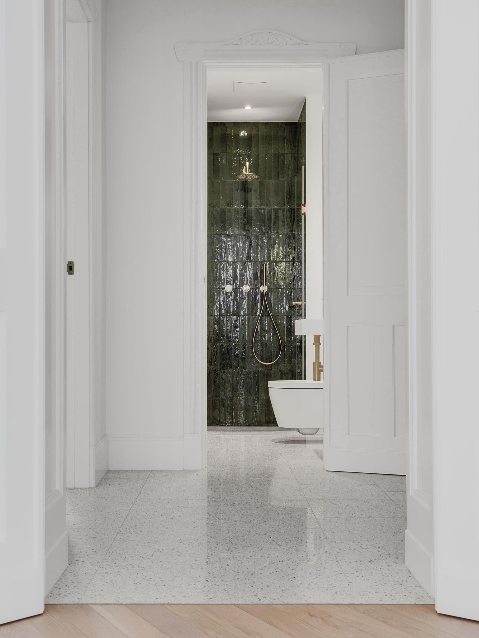 Structural changes were made to the floor plan to renovate the master and guest bathrooms. Terrazzo floors and unusual accents using tilework and mirrors harmonize effortlessly with the coffered doors and ornate door frames. Windows, ceiling spotlights, and skylights in the master bathroom create light that is at once functional and atmospheric.