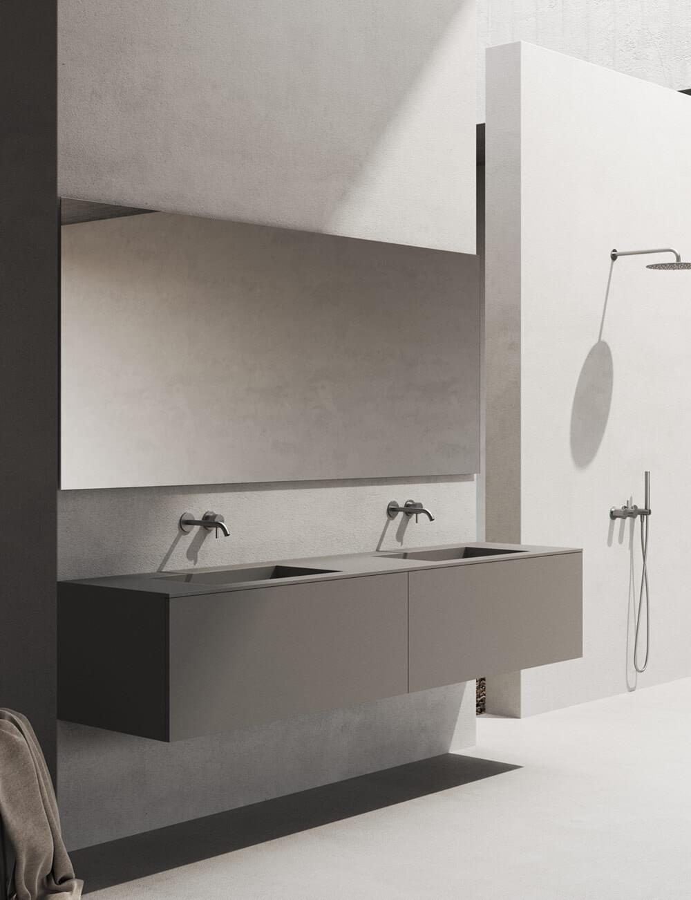 NANO bringt puristische Eleganz ins Bad: Der Waschtisch wird auf deine Anforderungen maßgefertigt und ist in verschiedenen Farbvarianten erhältlich – mit einer möglichen Gesamtlänge bis zu 270 cm. NANO ist vielseitig und nach individuellen Wünschen konfigurierbar: mit Einzel- oder Doppelbecken, wandhängend oder integriert in unsere VALLONE Möbelkollektionen. NANO ist zudem als maßgefertigte Waschtisch-Konsole erhältlich, z.B. zur Platzierung eines Aufsatzbeckens.