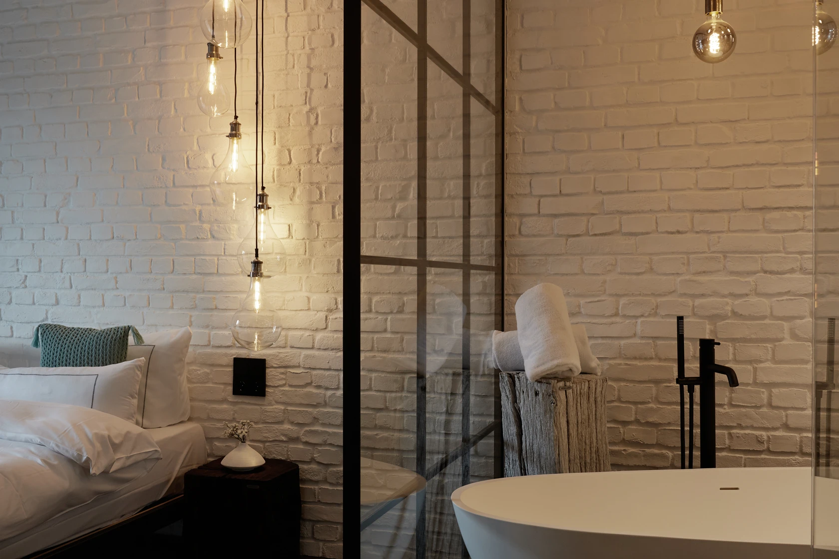 Spielerisch und fließend verschmelzen Wohn- und Badbereich in den Design-Suiten zu einer Wohlfühl-Oase der besonderen Art. Die minimalistischen und detailaffinen Wohn- und Schlafbereiche überschneiden sich mit der VALLONE®-Maxime: home suite home.