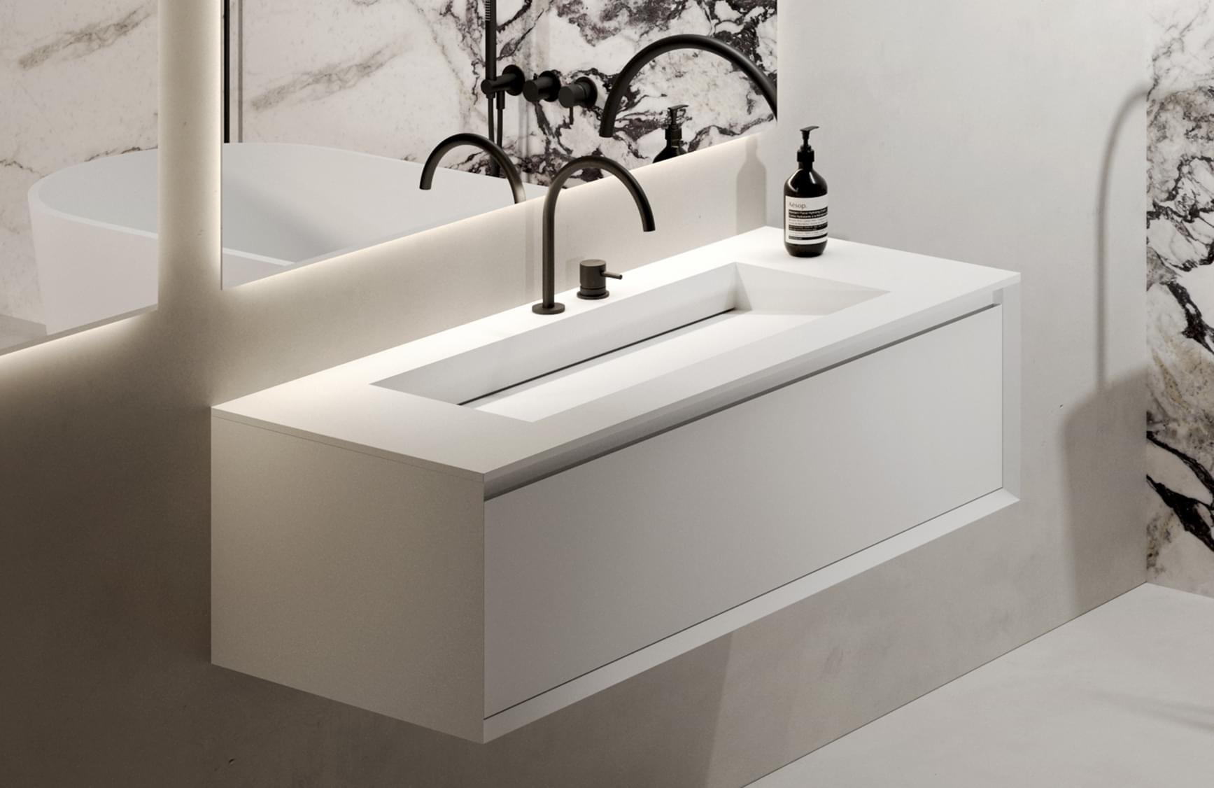 Ideally, the customized QORO SLOPE, COVER and BLADE sinks are combined with the VALLONE® ONEup, LAX and TREMEZZO furniture collections, either as wall-mounted or integrated versions.