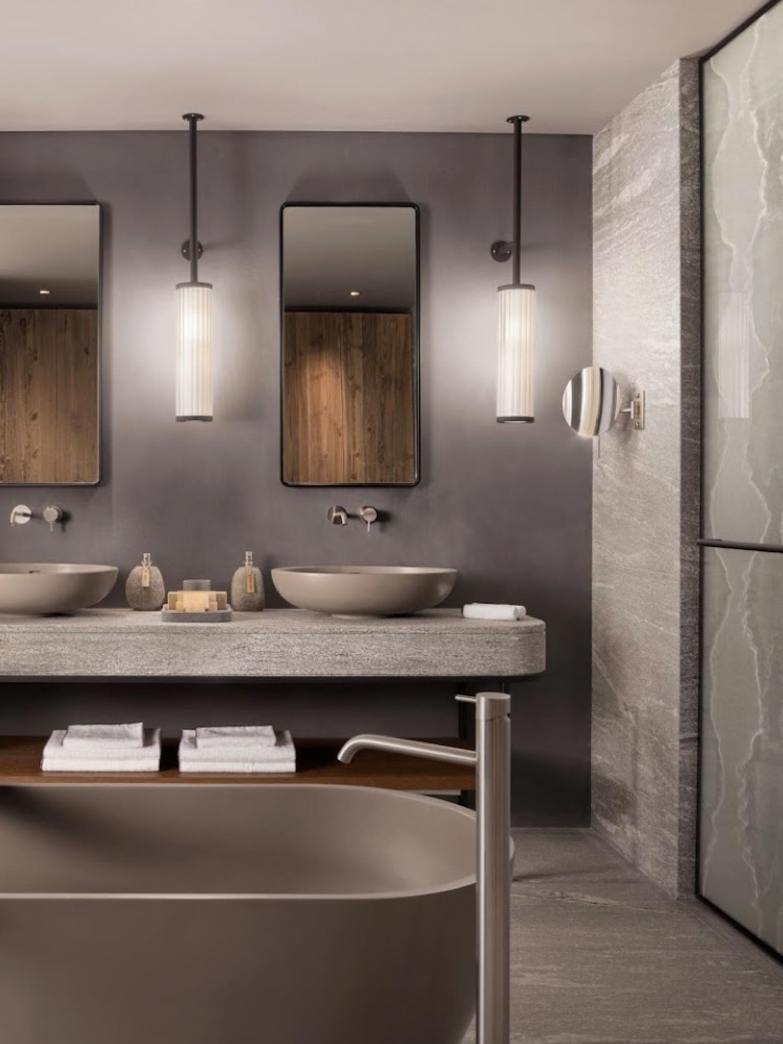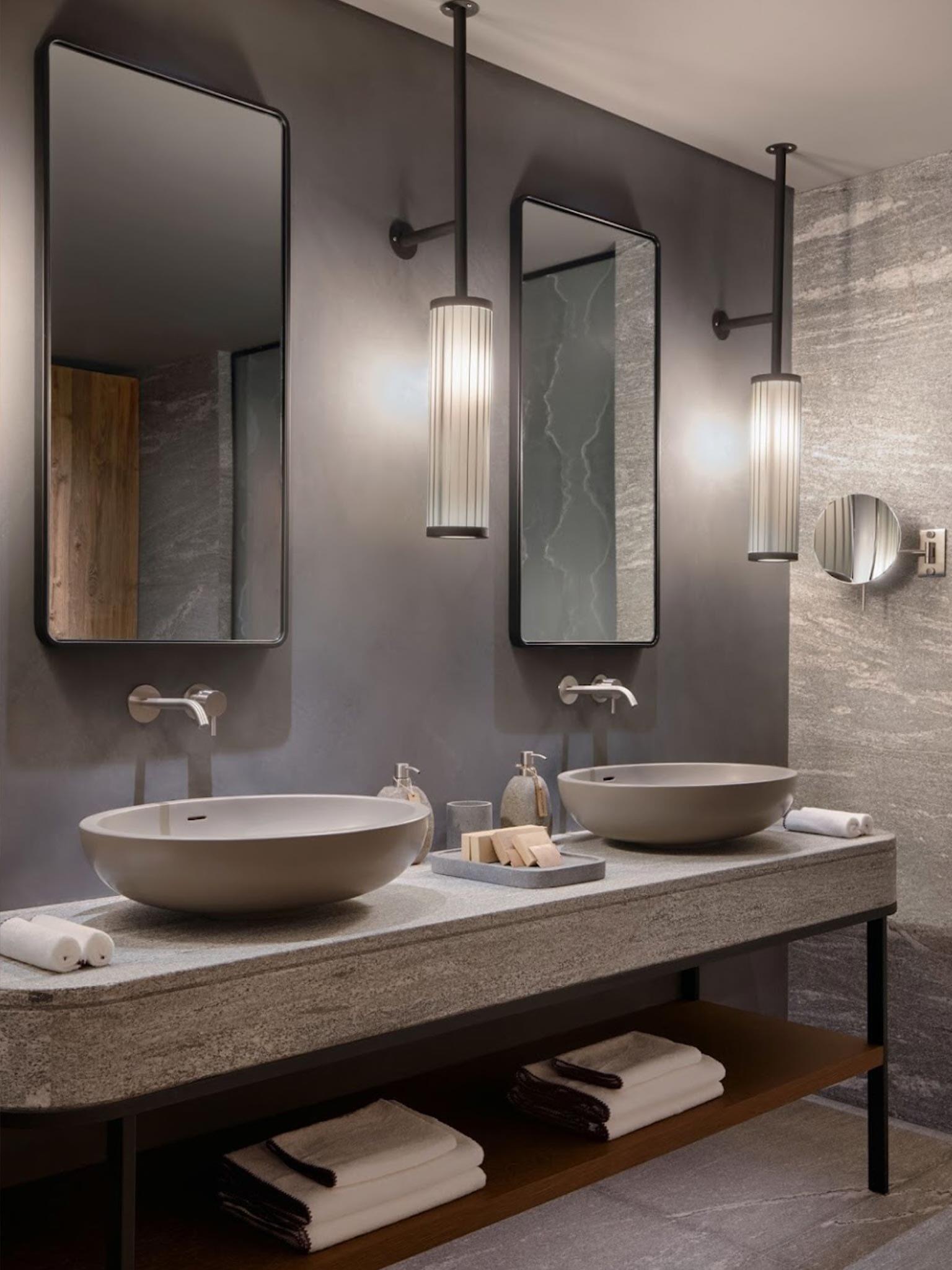 Für diesen fast schon surreal schönen Ort schufen wir gemeinsam mit dem Pariser Architekturbüro AW² Lösungen für eine Bad-Architektur, die eine perfekte Synthese von Eleganz und Natürlichkeit vermittelt. Eine Komposition sanfter, warmer Farbtöne, perfekt auf die Ästhetik des modernen Chalet-Stils abgestimmt. Da viele Zimmer und Suiten über eine freistehende Badewanne verfügen, haben wir eigens für das Projekt ein individuelles Badewannen-Design kreiert, welches mit symmetrisch verlaufenden Konturen für ein ideales Zusammenspiel von Ästhetik und Komfort sorgt.